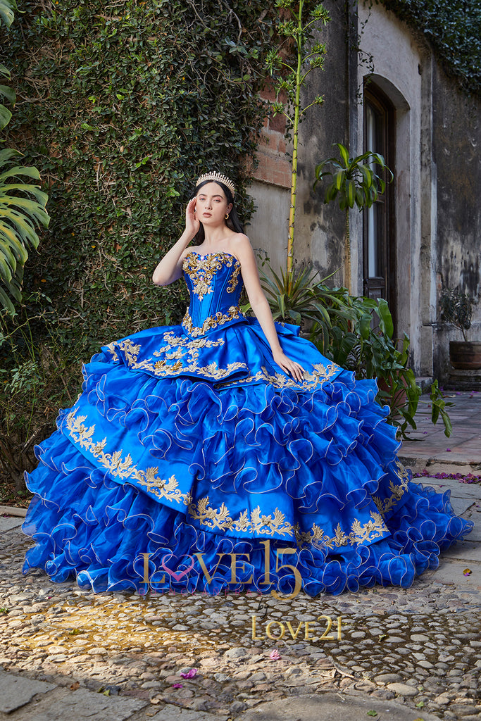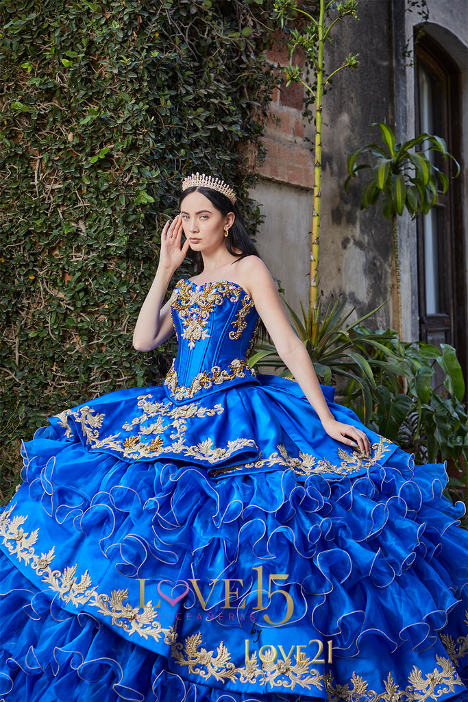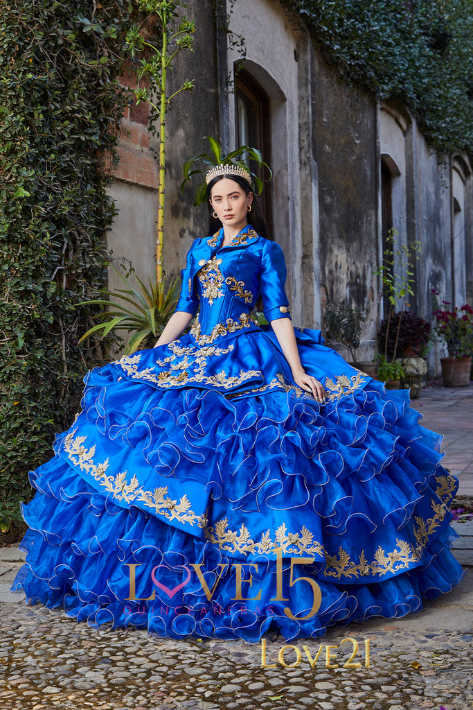 Este impresionante vestido de XV años combina lo mejor de la tradición mexicana con un diseño moderno y versátil. El verdadero toque distintivo de este vestido es su torera a juego, una prenda tradicionalmente charra que se coloca sobre el vestido y le da un estilo audaz y elegante. La torera está elaborada con un diseño intrincado de bordados y botones metálicos, lo que aporta un aire de distinción y autenticidad. Gracias a la torera, el vestido se convierte en una prenda con dos looks en uno: uno más formal y tradicional, con la torera puesta, y otro más ligero y romántico, al quitar la torera y dejar solo el corset y la falda.